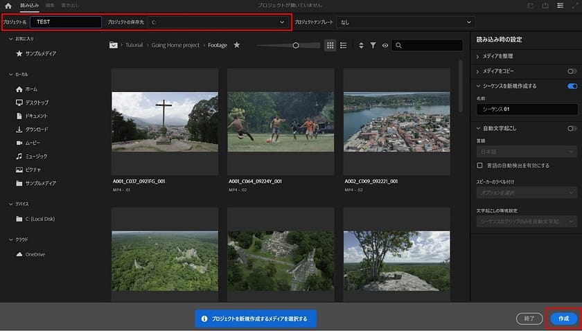 2.プロジェクト名を入力後、保存先を指定し、右下の「作成」ボタンを選択します。