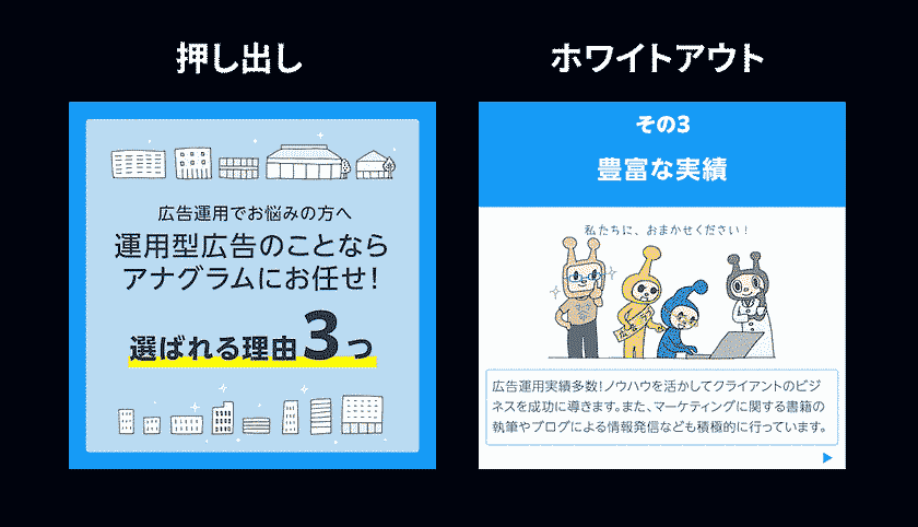 今回の構成では「タイトル〜 シーン3」までを「押し出し」によるスライドショー風に。シーン3からCTAは「ホワイトアウト」による演出となっているのでそれぞれ適用させていきます。