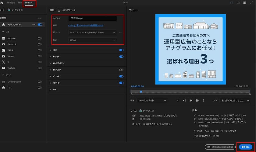 ※PremiereProでは、出力のファイル形式を「jpeg」「アニメーションGIF」など自由に選べるので、目的に応じて変更してください。SNSの投稿や広告で使う場合、あらかじめ入稿規定をチェックしておきましょう。