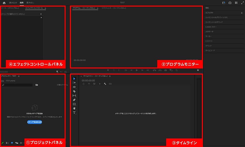 Premiere Proの操作画面は、基本的に4つのパネルで構成されています。