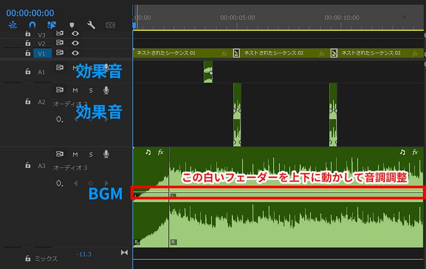 1.音素材のボリュームをそれぞれ調整していきます。上記図「ボリューム調整」の赤枠内の線をドラッグすると全体のボリュームを調整できます。