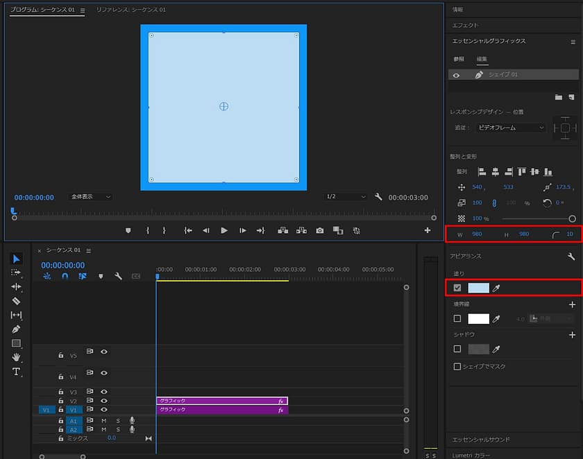 ※エッセンシャルグラフィックス・・・画像やテキスト、図形といった要素のサイズ・位置・塗り・境界線などを簡単に調整できる機能