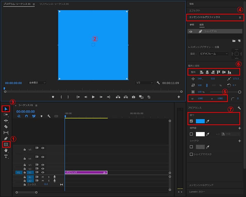 1.①長方形ツールを選択します