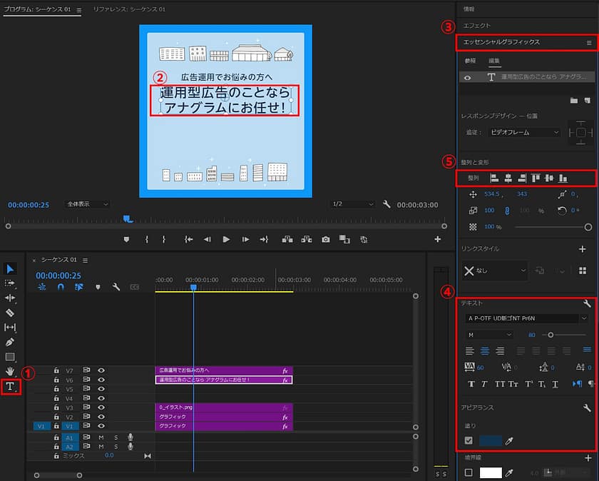 3.③エッセンシャルグラフィックスを選択し、文字の細かな設定を④テキストと⑤整列で調整します。今回は上記の図の設定で作成していますが、好みや顧客の要望に沿って適宜調整してください。
