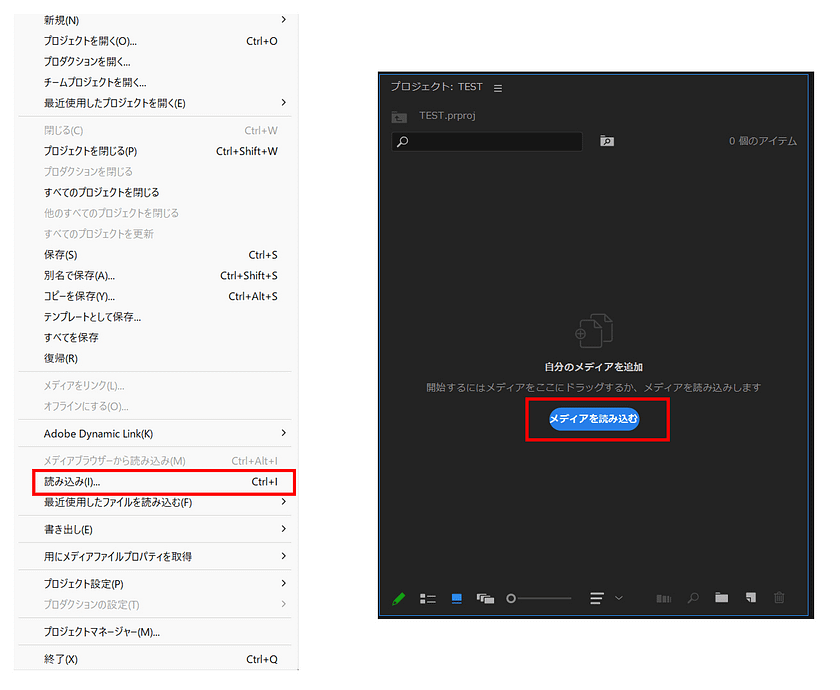 1.「ファイル」→「読み込み」、もしくはプロジェクトパネルの「メディアを読み込み」ボタンを選択します。