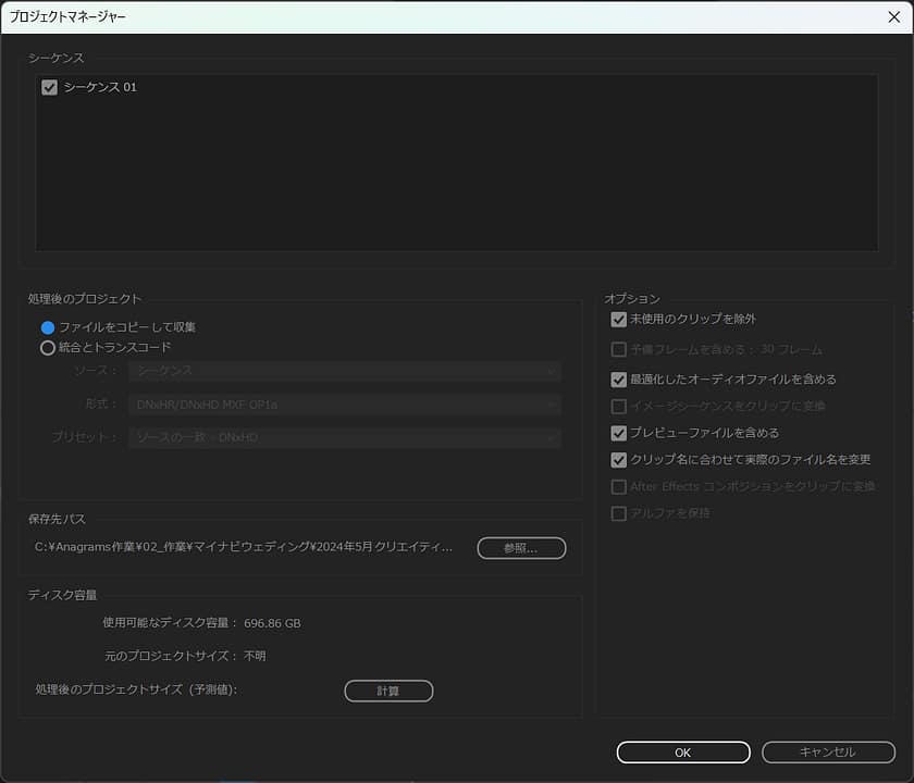 もし、別々の場所から素材をインポートした場合にも、PremiereProには最終的に1つのフォルダにまとめる機能もあるのでご紹介します。とくに、他の方へ業務を引き渡す際には必須になるのでぜひ覚えておきましょう。