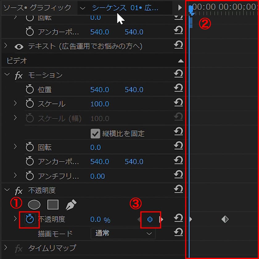 2.エフェクトコントロールパネルで、アニメーションを適用したいプロパティ(例:不透明度)の横にある①アニメーションのOn/Offをクリックしキーフレームの設定ができるようにします。