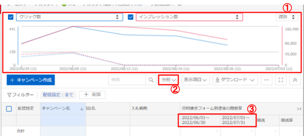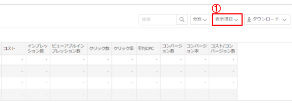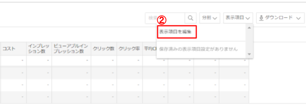 ①広告管理画面を開き、キャンペーンまたは広告グループ、広告の一覧画面の右上[表示項目]をクリック