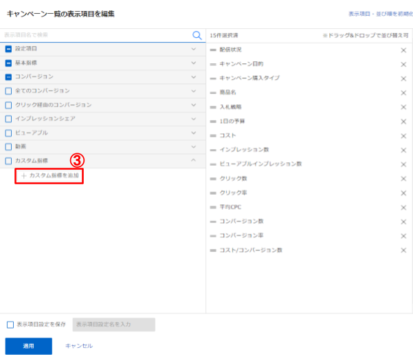 ③表示項目の一番下にある[+カスタム指標を追加]をクリック
