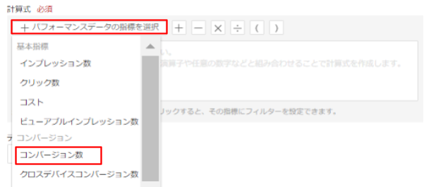 カスタム指標を追加する際に、[+パフォーマンスデータの指標を選択]から[コンバージョン数]を選択します。