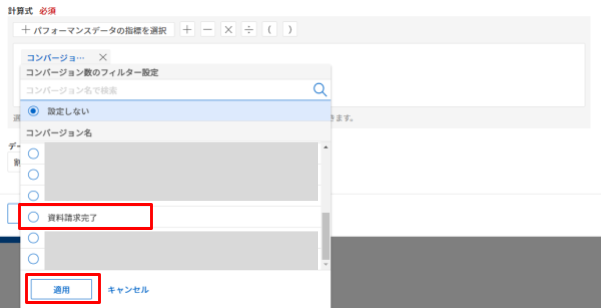すると、計測しているコンバージョンの名前が一覧で表示されるので、広告管理画面の指標に表示したいコンバージョンを選択して[適用]ボタンをクリックします。