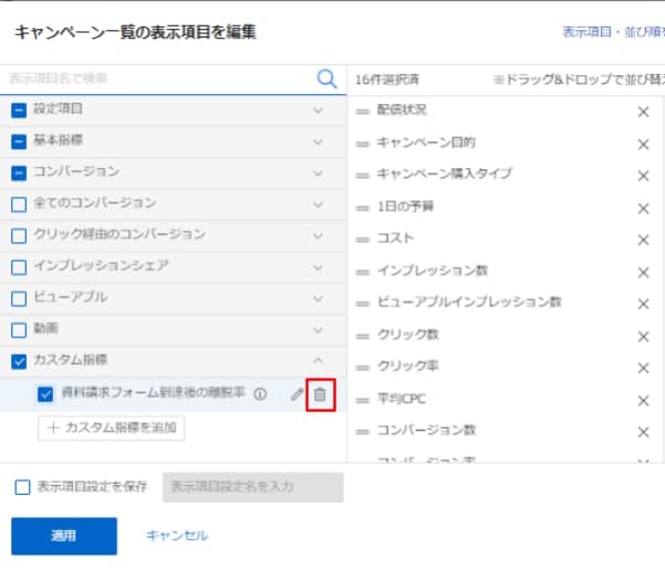 作成したカスタム指標は、カーソルを合わせて表示されるゴミ箱ボタンからいつでも削除できます。