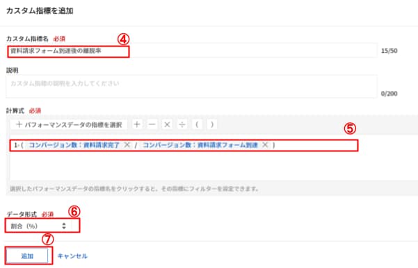 まず、カスタム指標の作成手順を説明します。今回は例として「資料請求フォーム到達後の離脱率」のカスタム指標を作成します。
