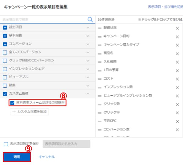 資料請求や問い合わせなど、定期的に確認している特定のコンバージョンはつねに見るべき指標としてパフォーマンスデータに追加しておきましょう。