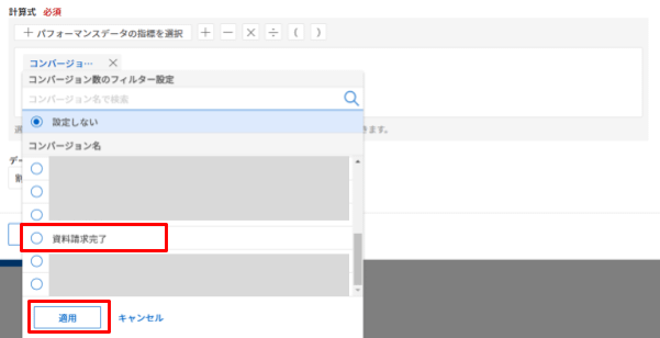 カスタム指標を追加する際に、[+パフォーマンスデータの指標を選択]から[コンバージョン数]を選択します。