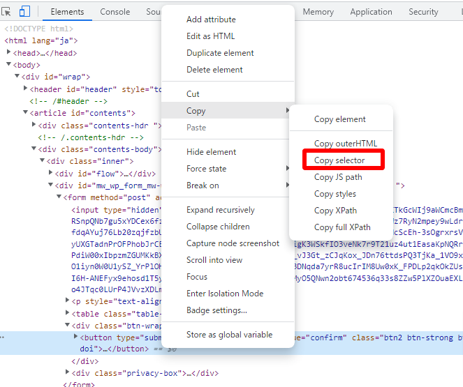 トリガーを実行したい要素を開き、右クリックして「Copy」→「Copy selector」を選択します。