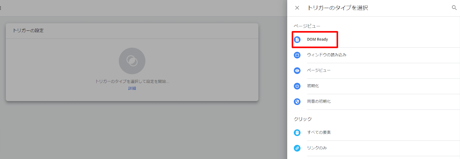 トリガーのタイプは「DOM Ready」を選択します。