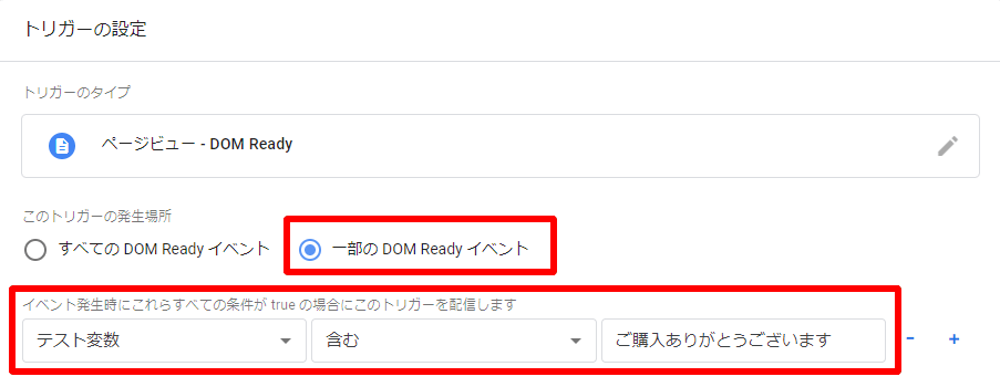 「このトリガーの発生場所」を「一部のDOM Readyイベント」に設定し、条件の欄を先程作成した変数とトリガーを実行したいテキストに設定します。