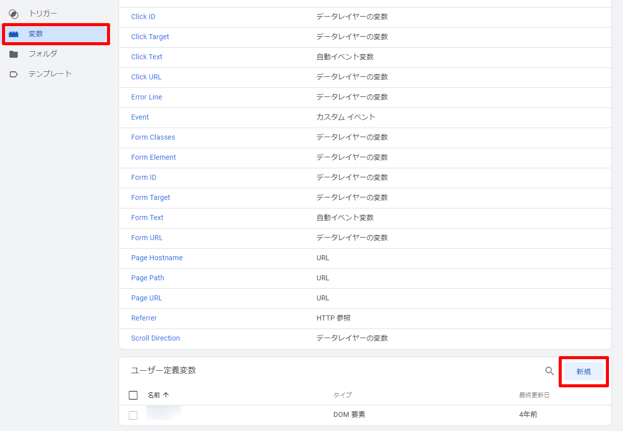 GTMを開き、「変数」から「ユーザー定義変数」の「新規」を選択します。