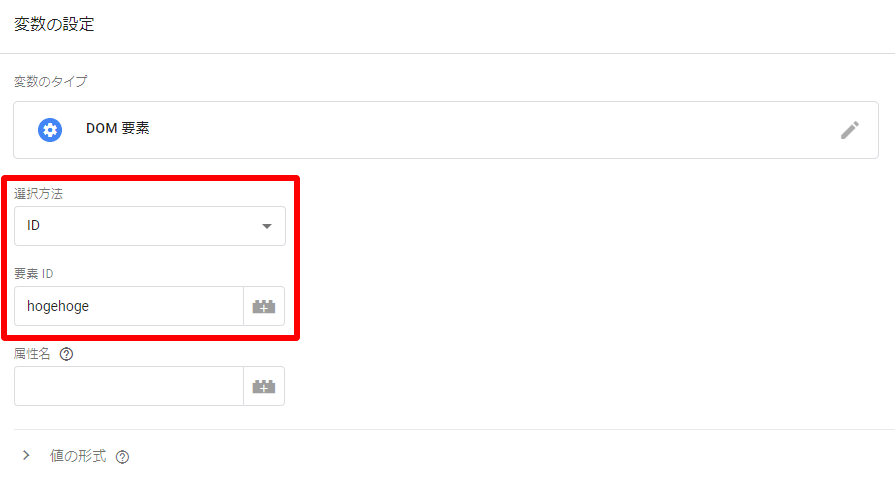 「選択方法」で「ID」を選択し、「要素ID」に id=”hogehoge”のhogehogeの部分を記入します。