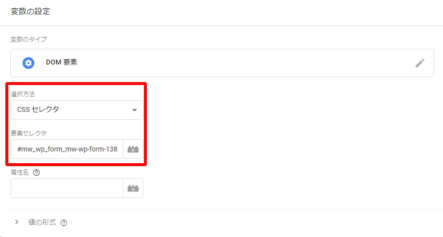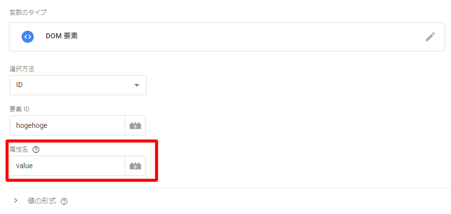 設定方法はこれまでの方法で選択方法を設定したあと、「属性名」の欄にHTMLで指定されている属性名(ここではvalue)を設定するだけです。