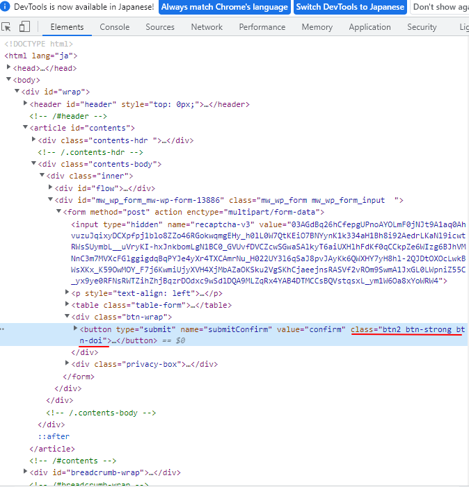 対象のボタンの要素がハイライトされたソースが開くので「id」が設定されているか確認します。