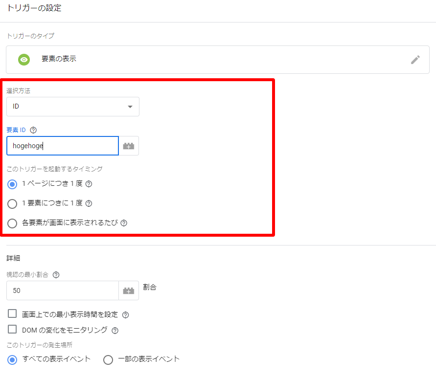 トリガーの条件の指定には上記の「id=”hogehoge”」の部分で示されているIDに指定されている値または、CSSセレクタ(※)の2つを用いることができます。
