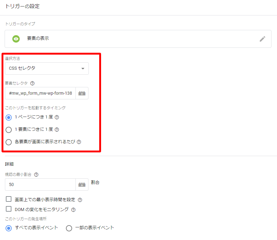 「このトリガーを起動するタイミング」は特別な事情がない限り「1ページに1度」にしておきましょう。