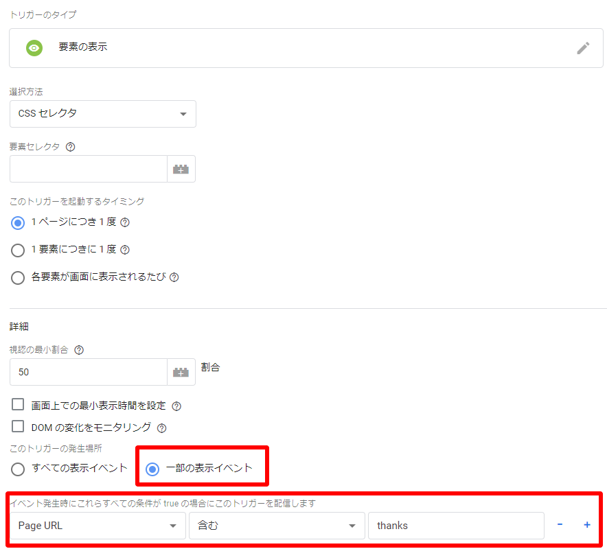 よくあるパターンが、サンクスページのURLが変わらない場合にトリガーを実行したい場合です。