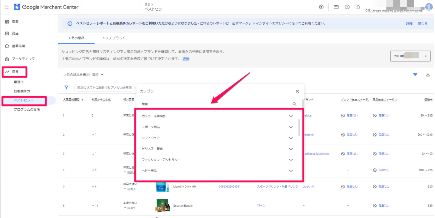 ショッピング広告と無料リスティングで特に人気の高いブランドと商品に加え、現在それらが商品フィードに掲載されているかどうかの情報も表示されます。