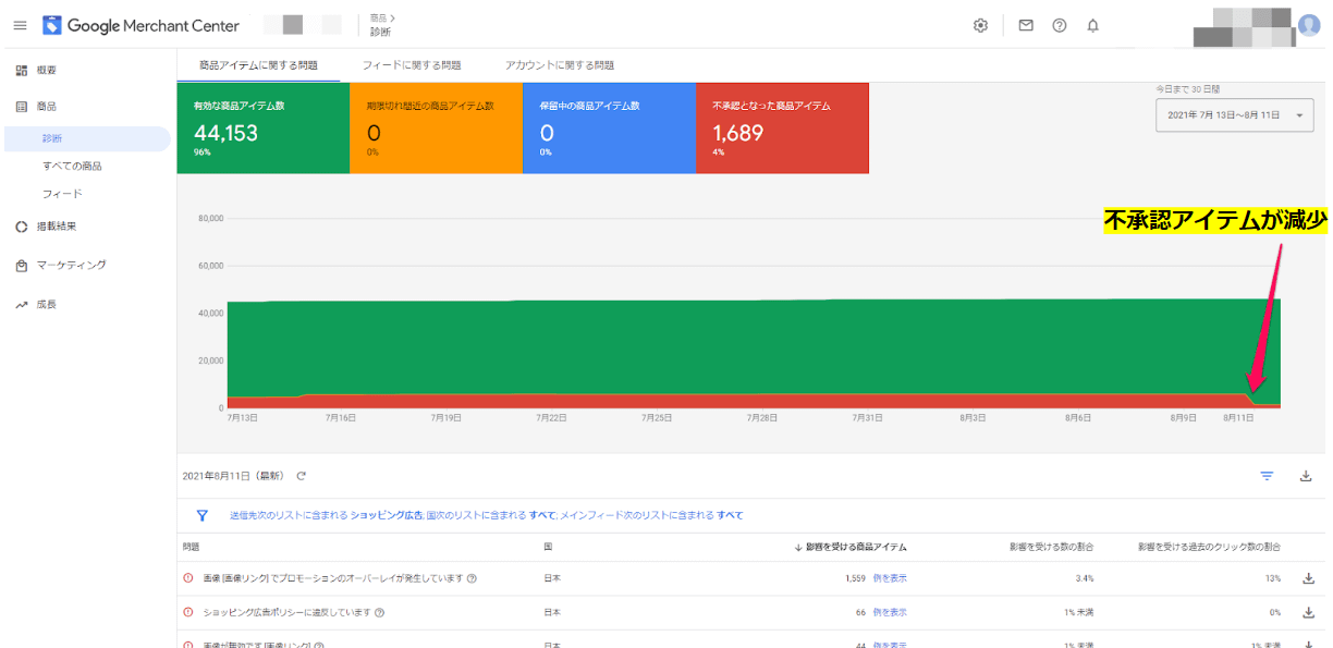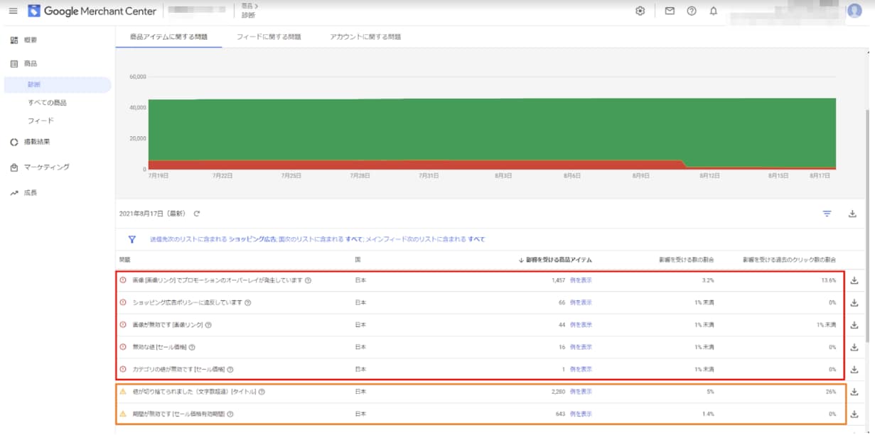 警告期間は、Google Merchant Center アカウント管理画面の [診断] ページにある [アカウントに関する問題] にも表示されます。