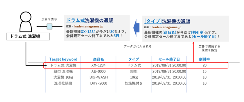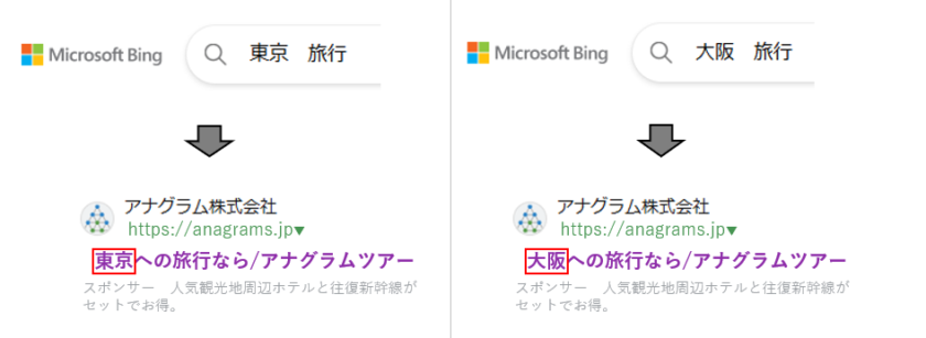 たとえば、広告カスタマイザを設定すると、図のように検索キーワードに合わせた広告文の出し分けが可能です。