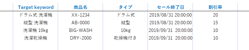| ターゲット キーワード テキスト | Target keyword text | ターゲットとするキーワード (マッチングの種類の構文 なし)。 | この属性は [ Target keyword match type] (ターゲット キーワード マッチングの種類) 属性との組み合わせでのみ使用できます。 |