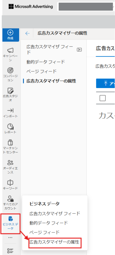 広告管理画面、左側ツールバーにある「ビジネスデータ」から、「広告カスタマイザーの属性」をクリック。