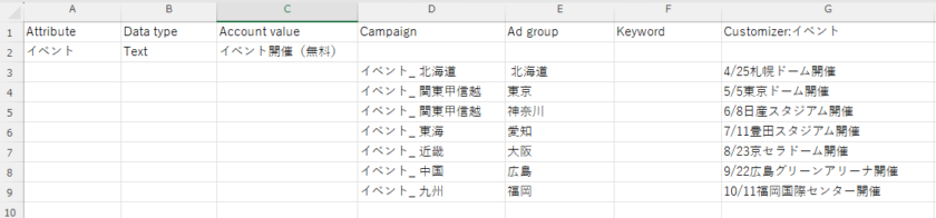 はじめに、広告カスタマイザフィードを使用した設定方法を見ていきましょう。ここからは、例として全国の主要都市でイベントを開催しているサイトの広告カスタマイザ設定を想定して、設定方法を解説します。