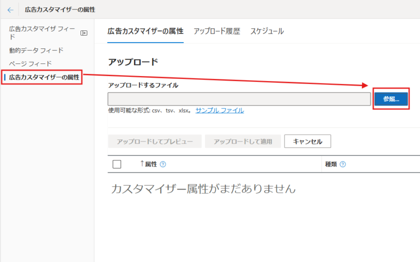 広告管理画面の「広告カスタマイザーの属性」から「参照」をクリック。
