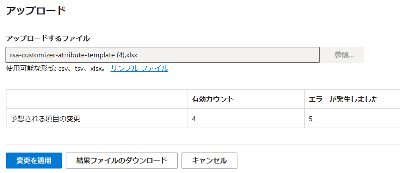 「アップロード」をクリックすると、「サンプルファイル」が表示されるのでダウンロードします。