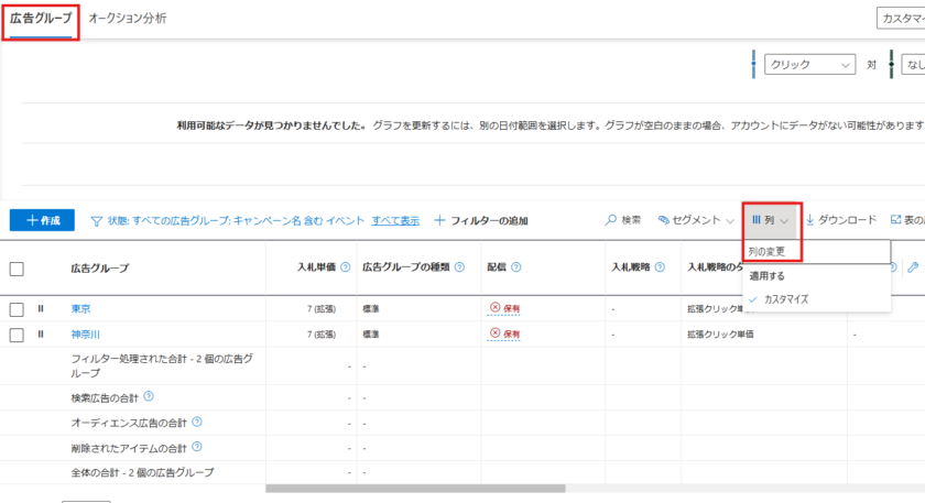 広告カスタマイザを設定したい階層(キャンペーン・広告グループ・キーワード)を選択。今回は地域ごとのイベント会場に合わせて広告文を変えたいので広告グループ単位で設定します。