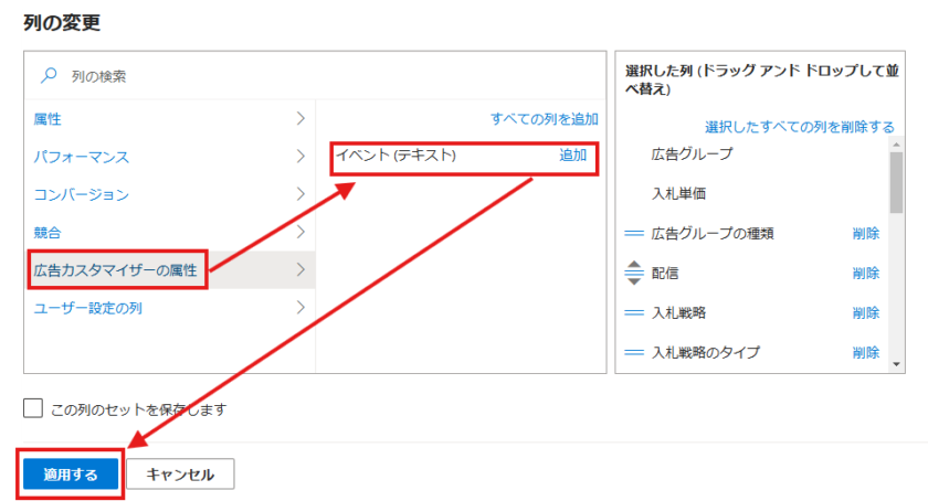 列の変更で、「広告カスタマイザの属性」から「イベント(テキスト)」を追加し「適用する」をクリックします。
