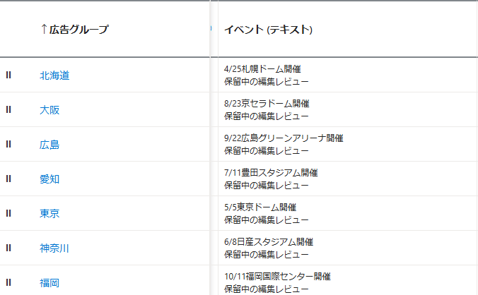 広告グループにイベント(テキスト)の列が追加されます。そして、フィードで設定した情報が確認できます。