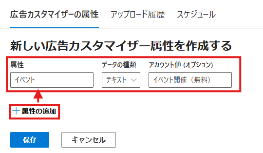 広告管理画面のビジネスデータから広告カスタマイザー属性を選択。「属性の追加」から属性/データの種類/アカウント値を記載し「保存」をクリックすると設定ができます。