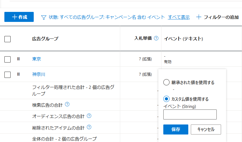 広告カスタマイザの列「イベント(テキスト)」が表示されます。