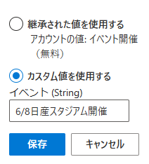 今回の設定では「カスタム値を使用する」に「6/8日産スタジアム開催」を記載します。