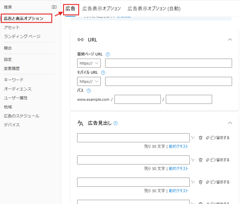 広告カスタマイザを挿入する広告文はインポートできないため、インポート後に追加する必要があります。