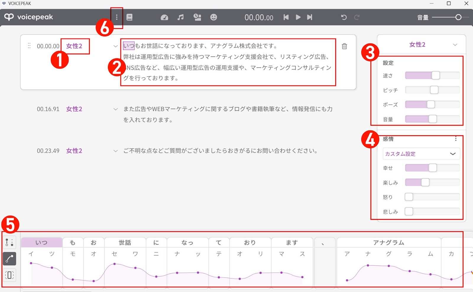 ④の「感情」という項目で「幸せ」「楽しみ」「怒り」「悲しみ」の4種類のパラメーターが調整可能です。おすすめは「幸せ」「楽しみ」のパラメーターで、値を約20〜50%でブレンドすると、通常よりもややピッチが高い状態になりハッキリした口調に聞こえます。デフォルトではすべての値が0%になっています。