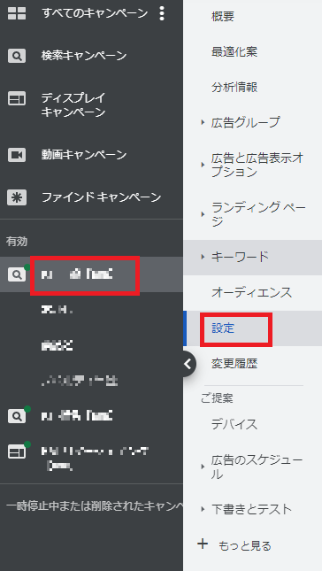 2.Google広告管理画面で、設定したいキャンペーンを選び、[設定]を開く