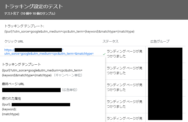 ランダムに選ばれた広告文10本のトラッキングテンプレート・最終ページURL・使われた属性が確認できるので、問題ないか確認しましょう。ステータスが「ランディングページが見つかりました」になっていれば問題なくリンク先が機能しています。