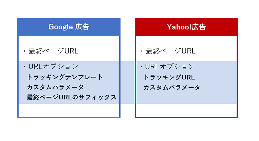 Google 広告とYahoo!広告のリンク先URLの設定はともに、「最終ページURL」と「URLオプション」から成り立っています。ValueTrackパラメータは「最終ページURL」および「トラッキングテンプレート」、「カスタムパラメータ」で利用できます。