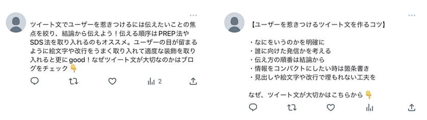 前段にもあったとおり、ユーザーはタイムラインを流れるように見ています。その中で自分にとって有益で興味のあるポストを瞬時に判断しているのです。ユーザーにとって複雑で伝わりにくい順序で書かれた投稿は、興味があるかどうかの判断ができずスルーされてしまう原因になります。