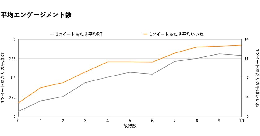 上のグラフは改行数ごとの平均いいね数/リポスト(旧:リツイート/RT)数を表しています。